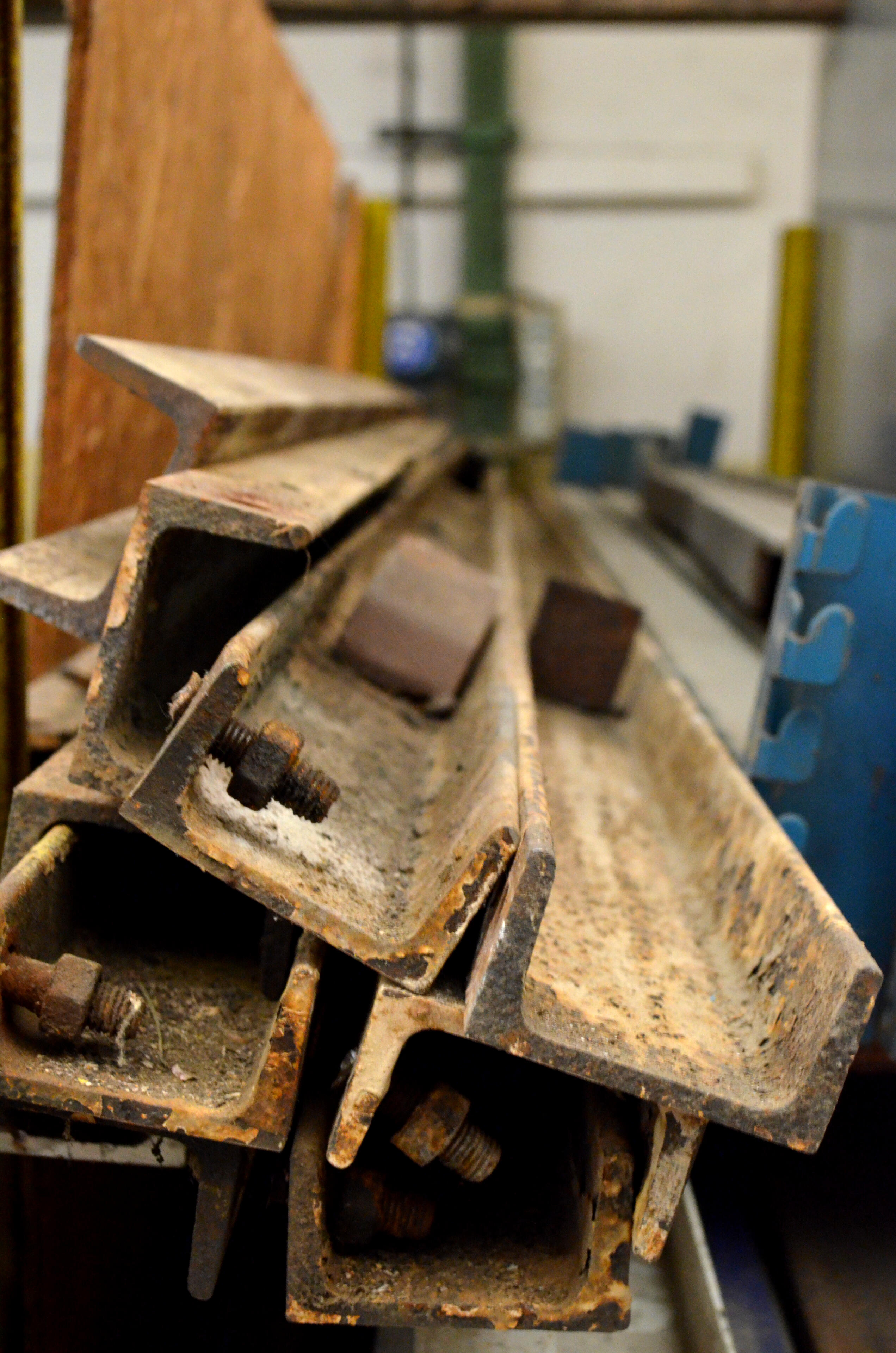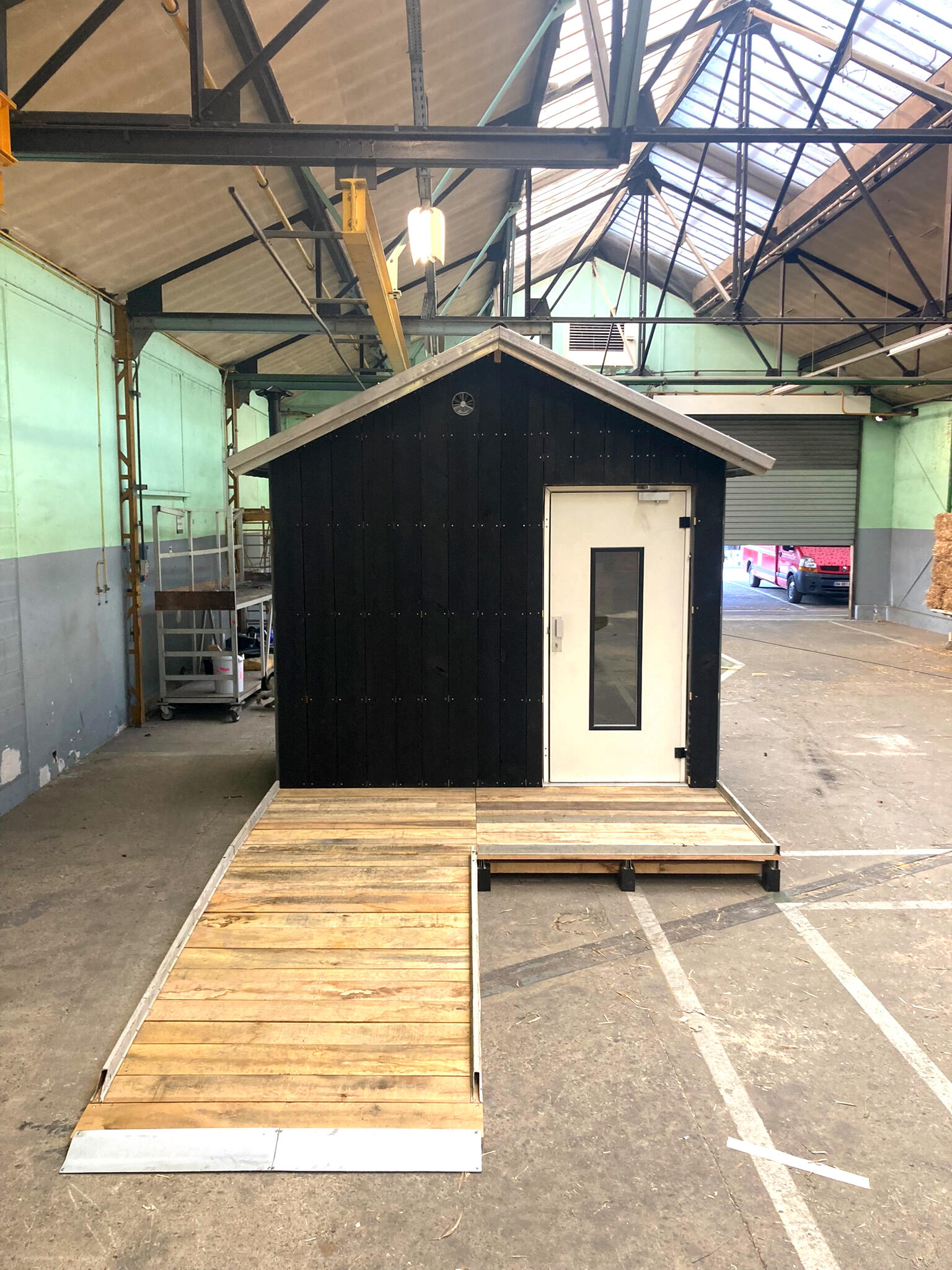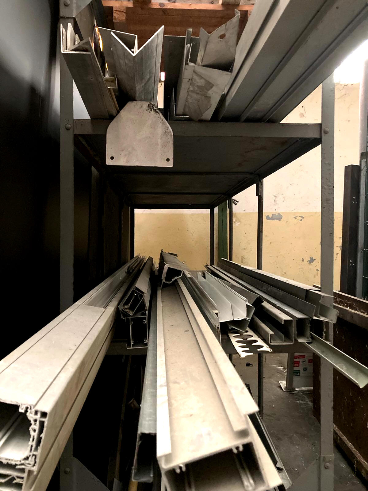 Devant la quantité de matière et l’étendue du site, nous choisissons de centraliser les ressources disponibles en créant une matériauthèque dans la travée Est du bâtiment ES10 (12,5x60m). Avec l'aide d'une équipe de déménageurs, l'espace est aménagé et organisé. La travée est divisée en trois couloirs : deux couloirs de matériaux mesurant 4m de large sont desservis par un axe central. Ces espace sont compartimentés grâce aux gisements de matériaux existants : des étagères de rangement métalliques. En parallèle, nous investissons dans l’achat de matériel de logistique (diable, transpalette…) pour le confort et la sécurité de l’usage collectif du lieu.
