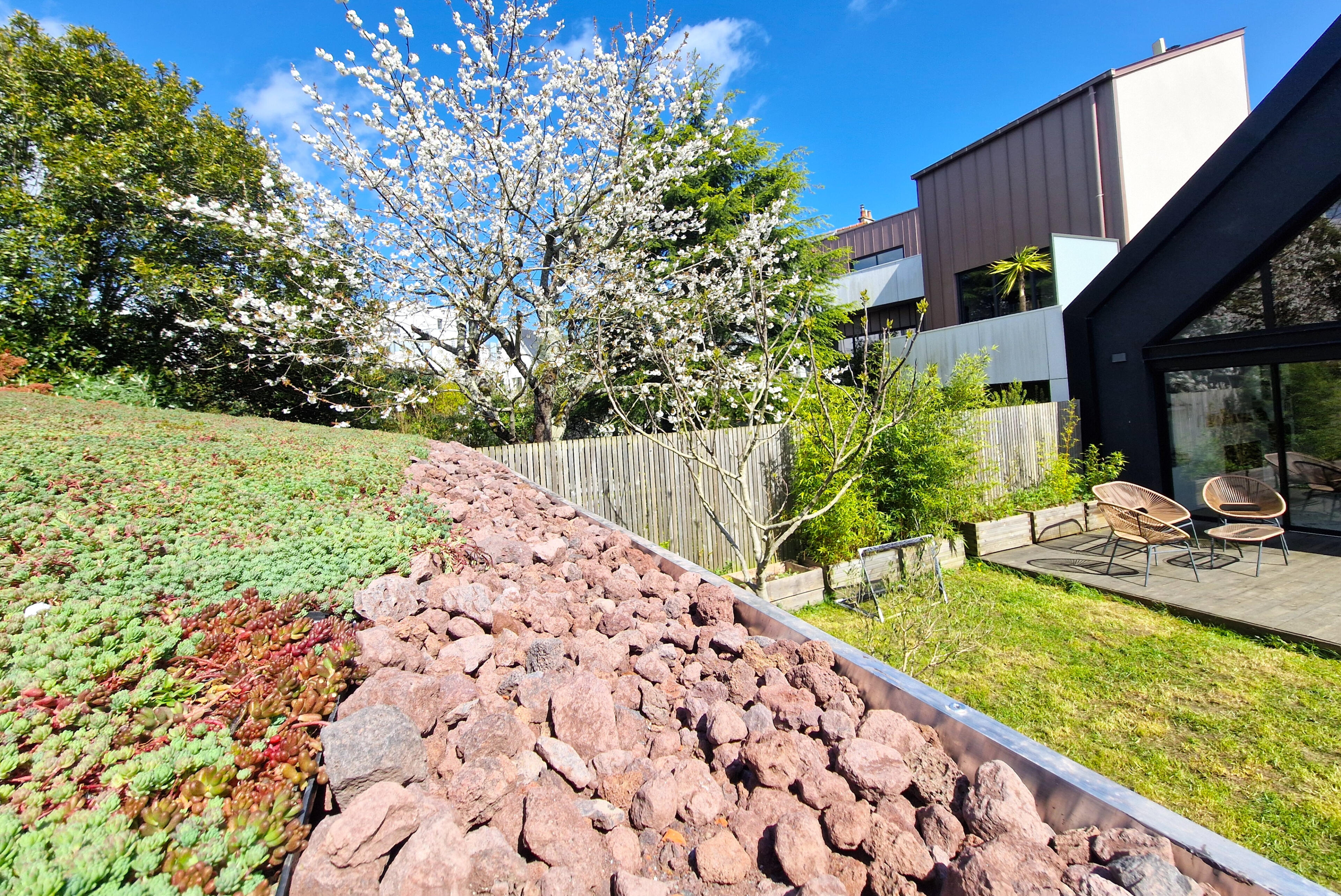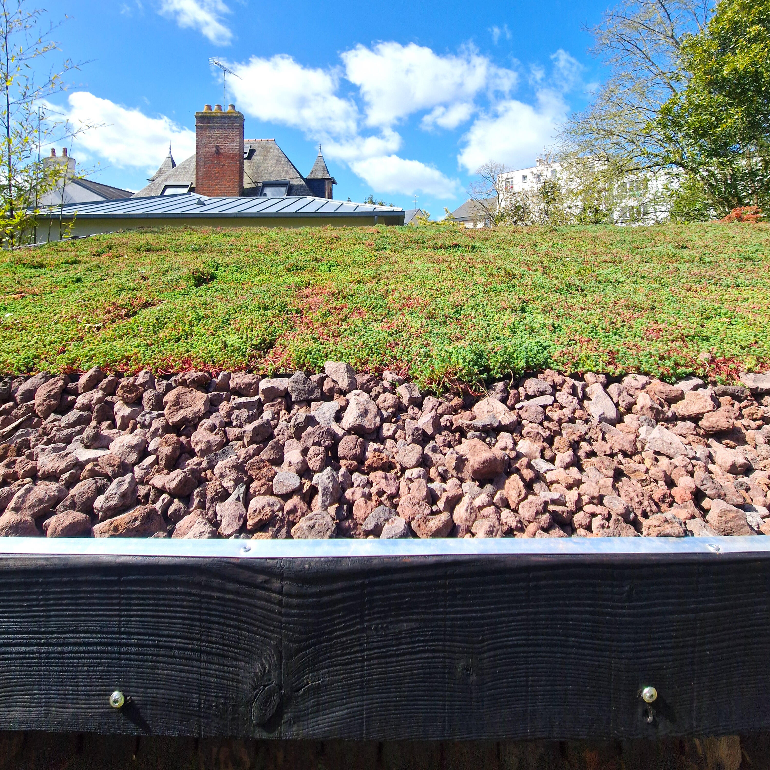 PLACE AU VÉGÉTALPuis vient le végétal. Le choix de dalles précultivées (fournies pas l'entreprise bretonne Distri Concept ), composées de pouzzolane et de sédums, permet d’allier efficacité technique et rendu immédiat. Ce système garantit une couverture homogène, pérenne et peu exigeante en entretien. Le vert s’installe, dense et homogène, contrastant avec les matériaux minéraux.En périphérie, la pouzzolane dessine une limite discrète et efficace. Elle accompagne le drainage, fait écho aux teintes du schiste rouge local et inscrit le projet dans une continuité architecturale respectueuse de son contexte.