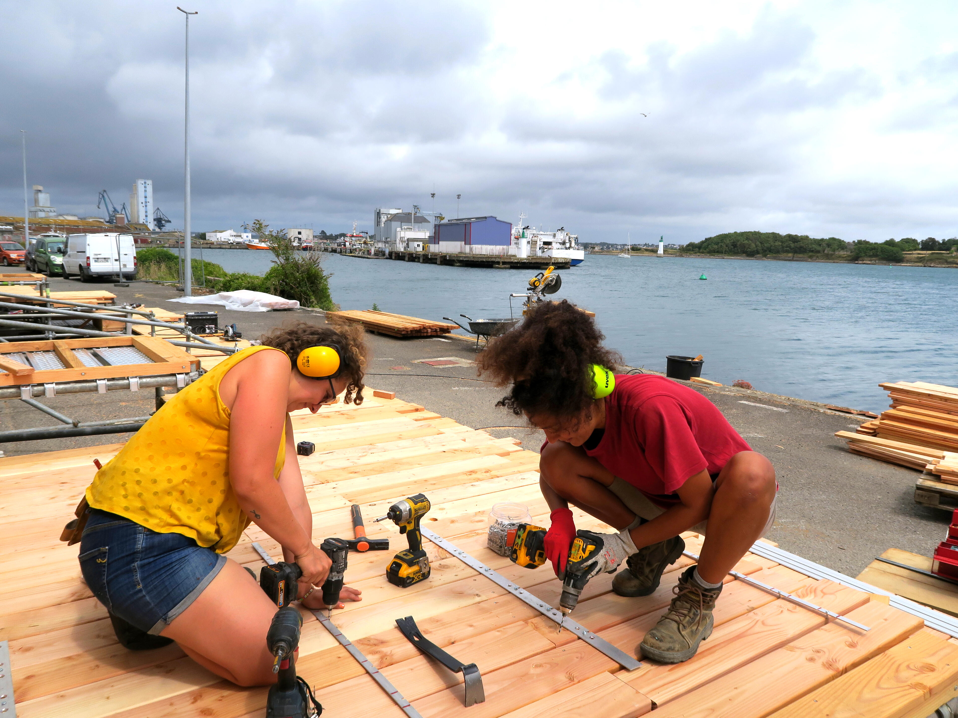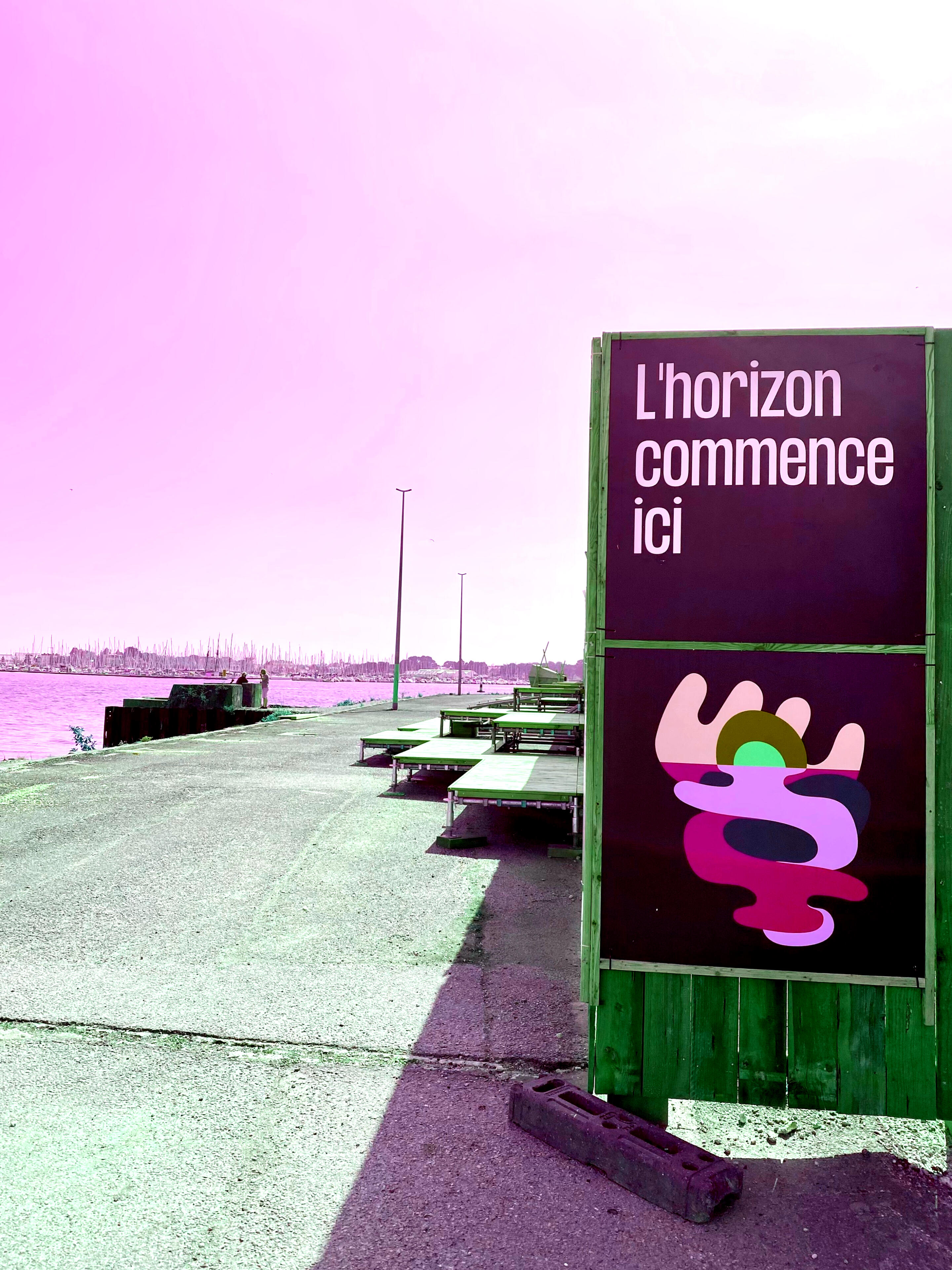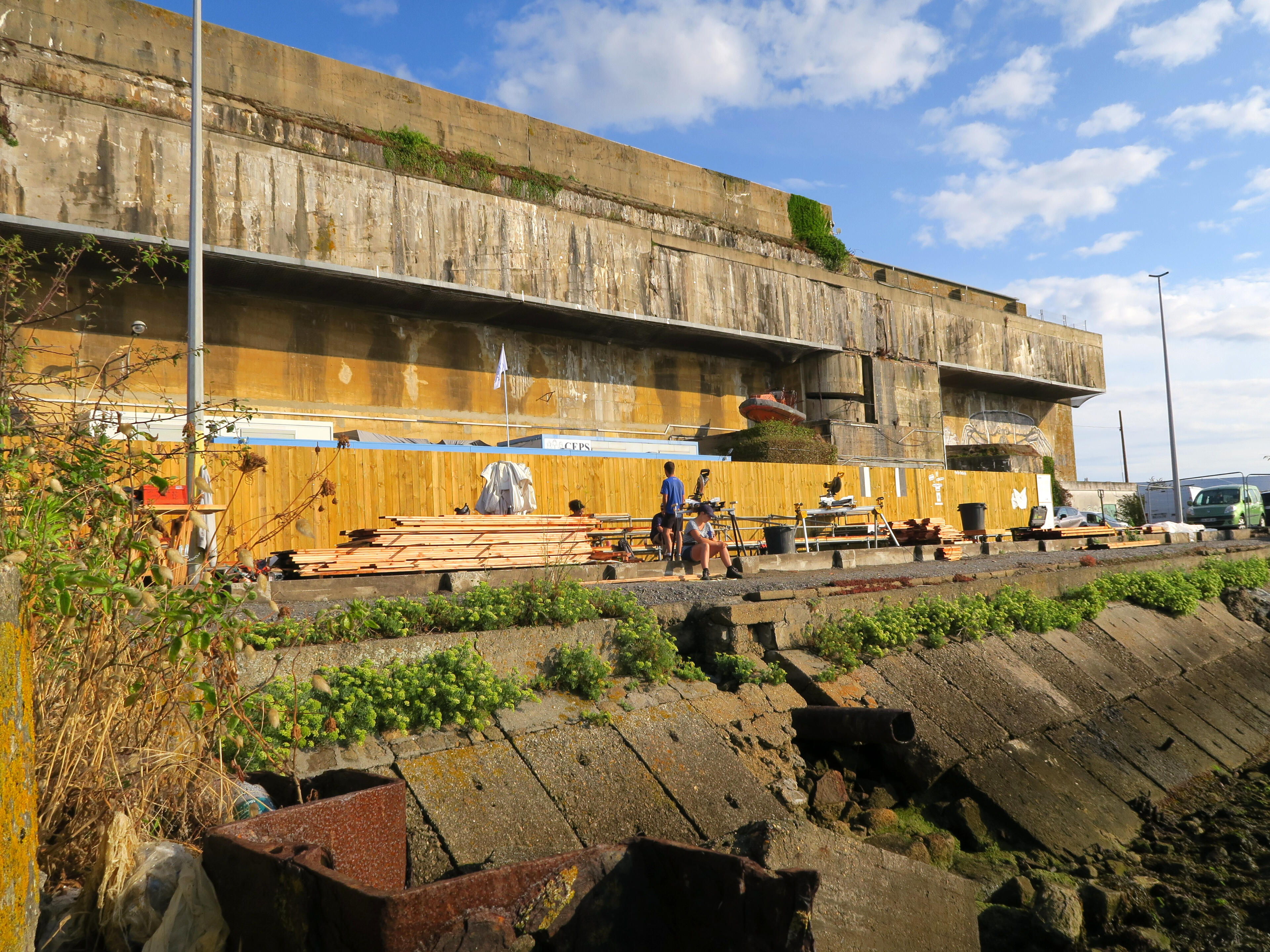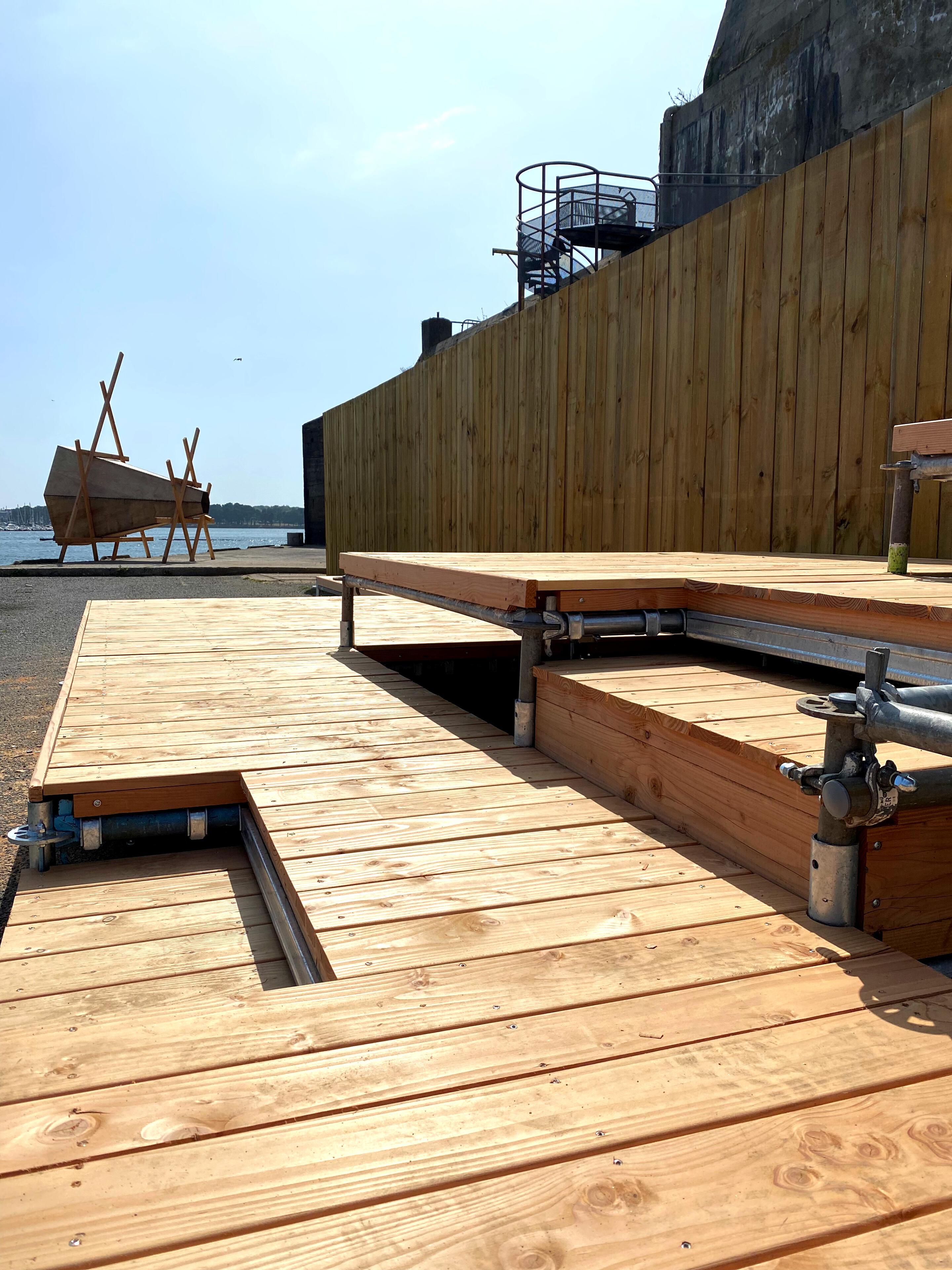 Dans le cadre du grand projet de restructuration des espaces publics de la base navale de Lorient Agglomération, l’agence d’architecture LIEUX et L’agence d’urbanisme et architecture ANYOJI BELTRANDO font appel à l’équipe des Animé.e.s pour réaliser en un temps record un immense gradin démontable sur la Pointe de Bernoulli.Cet endroit, initialement occupé par le CEPS, Centre d’Etude et Pratique de la Survie, adossé aux bunkers sous marinier construits pendant la seconde guerre mondiale, offre une vue exceptionnelle sur la rade de Lorient, l’horizon et la course du soleil.La pointe et ce gradin ont vocation à devenir un espace scénique activé tout au long de l’été 2025. Le collectif CAMP, en charge de la programmation culturelle de la Base navale, en fera un lieu privilégié d’expression artistique (collages, spectacles, concerts, tables rondes) dans le cadre du festival L’HORIZON COMMENCE ICI.