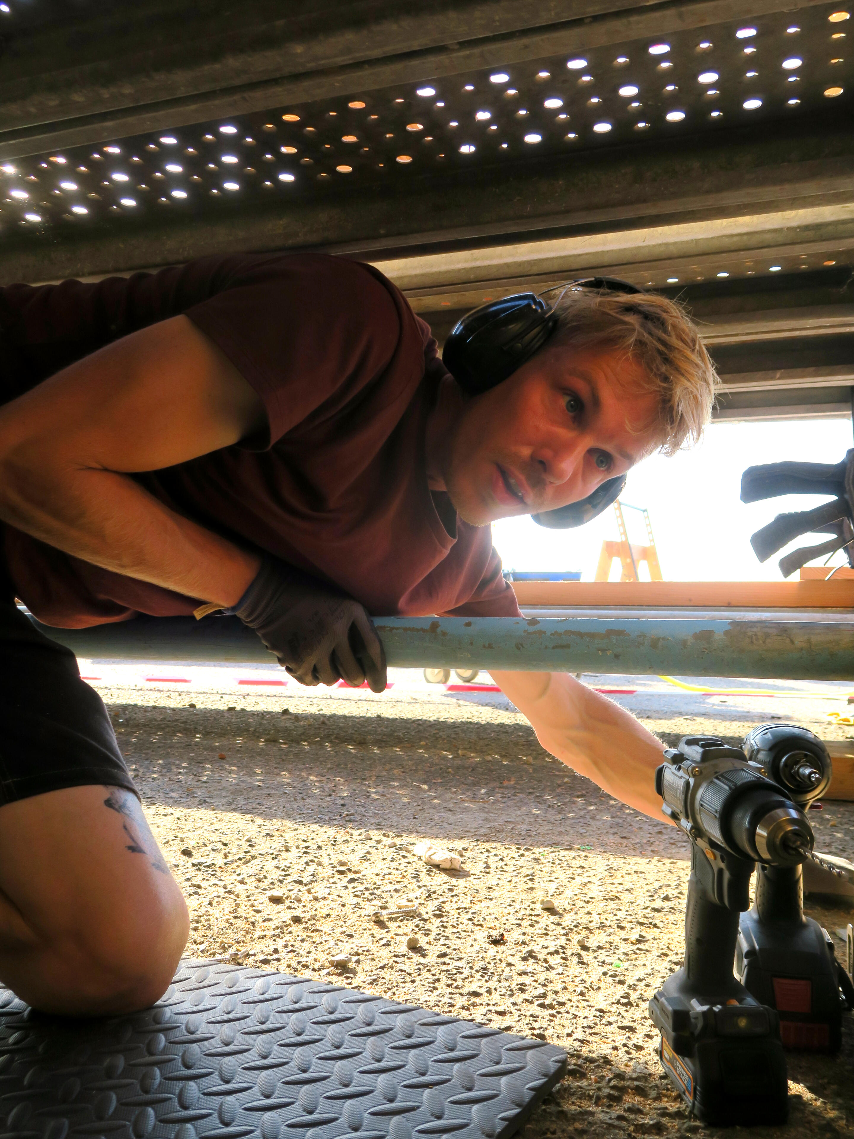 La quantité ne nous empêche pas de prêter une grande attention aux détails. La construction de guides perçages et de carottage facilitent la régularité.Le chantier est aussi support de formation avec Augustin, le stagiaire qui nous a prêté main forte.