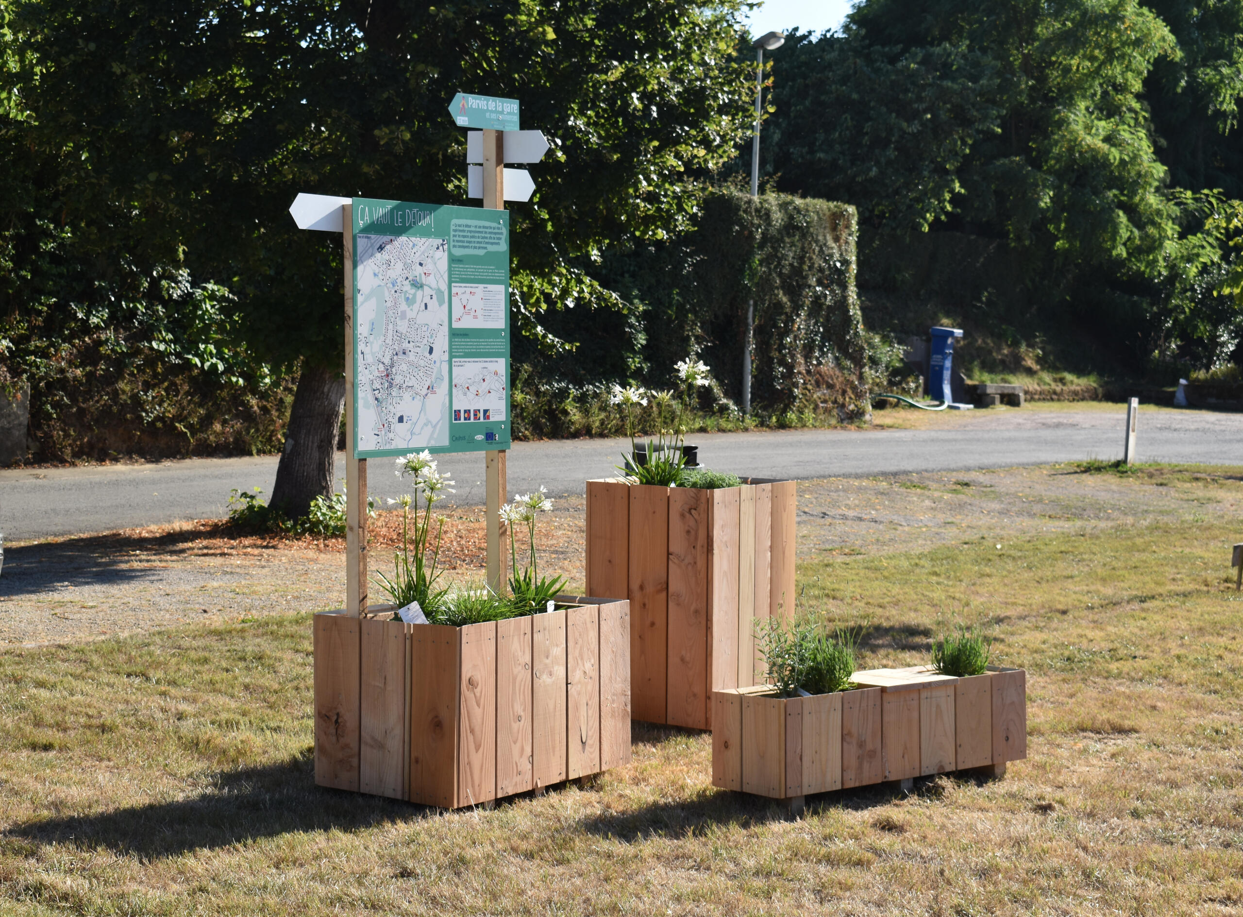 Les clôtures retirées révèlent la nécessité de penser les limites d’un espace sans voiture, sans créer de rupture avec le quartier. Pour ce faire, nous proposons une disposition originale de blocs rocheux, limites physiques aux voitures et supports d'espaces de convivialité.Pour valoriser les éléments de clôture déposés, nous les transformons en supports de signalétique et en totem d’accueil. L’élément qui auparavant séparait l’espace public de l’espace privé est désormais l’outil qui accueille le visiteur !