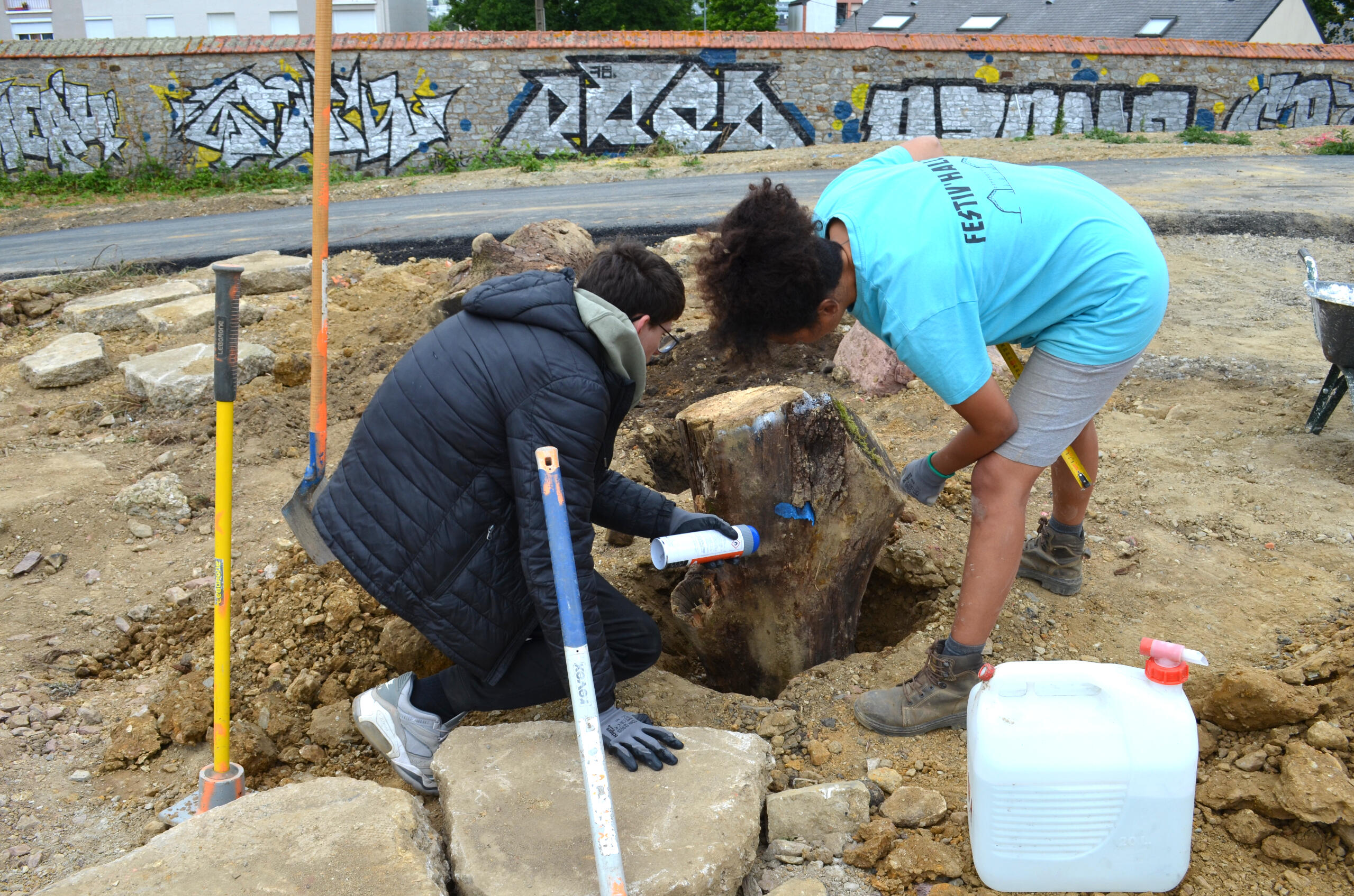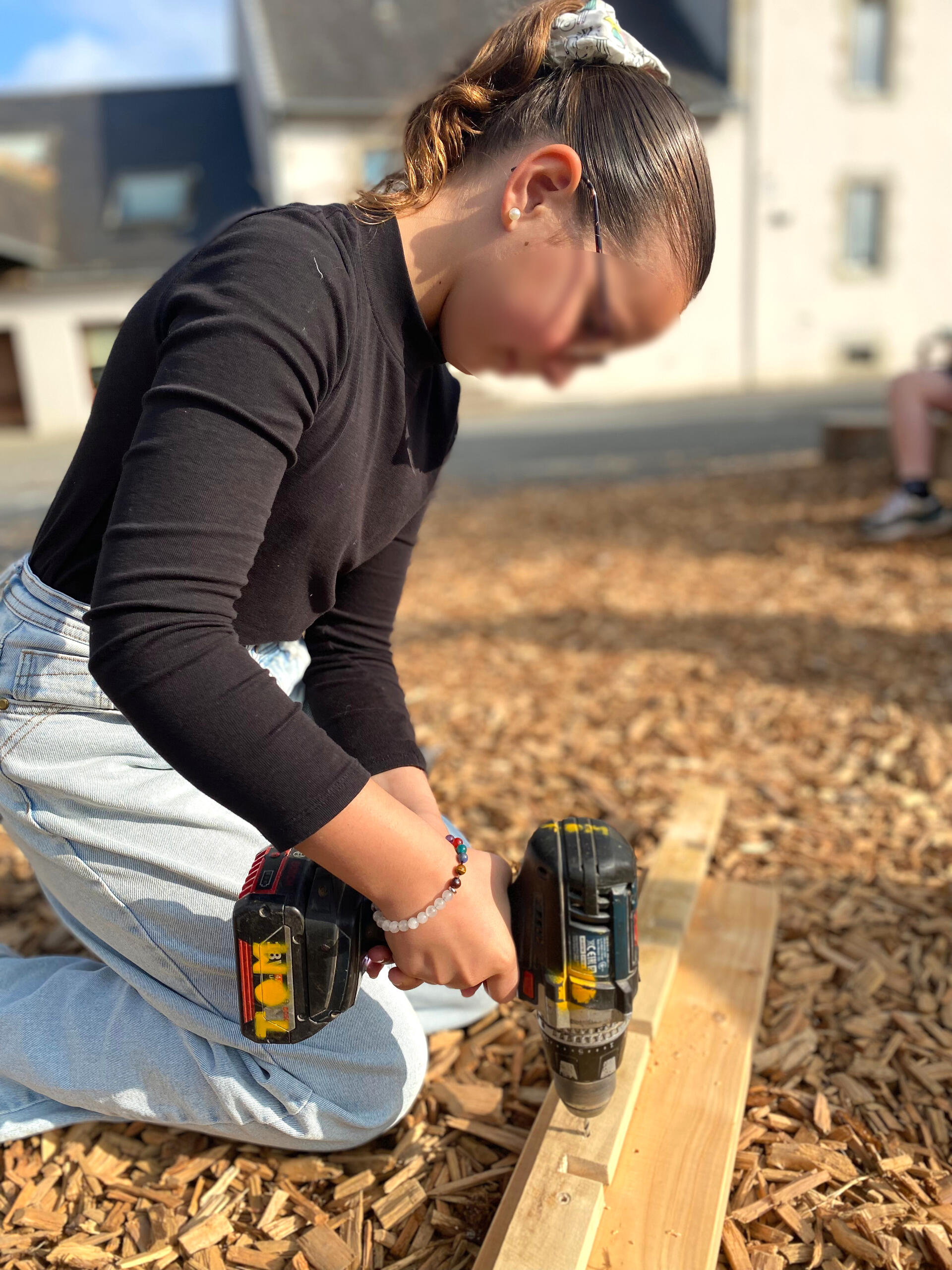 Ces pneus de kart récupérés ont trouvé une seconde vie !La première étape de chantier, réalisée avec des jeunes en formation, a été de préparer les 50 pneus en les remplissant de grave et en la compactant.