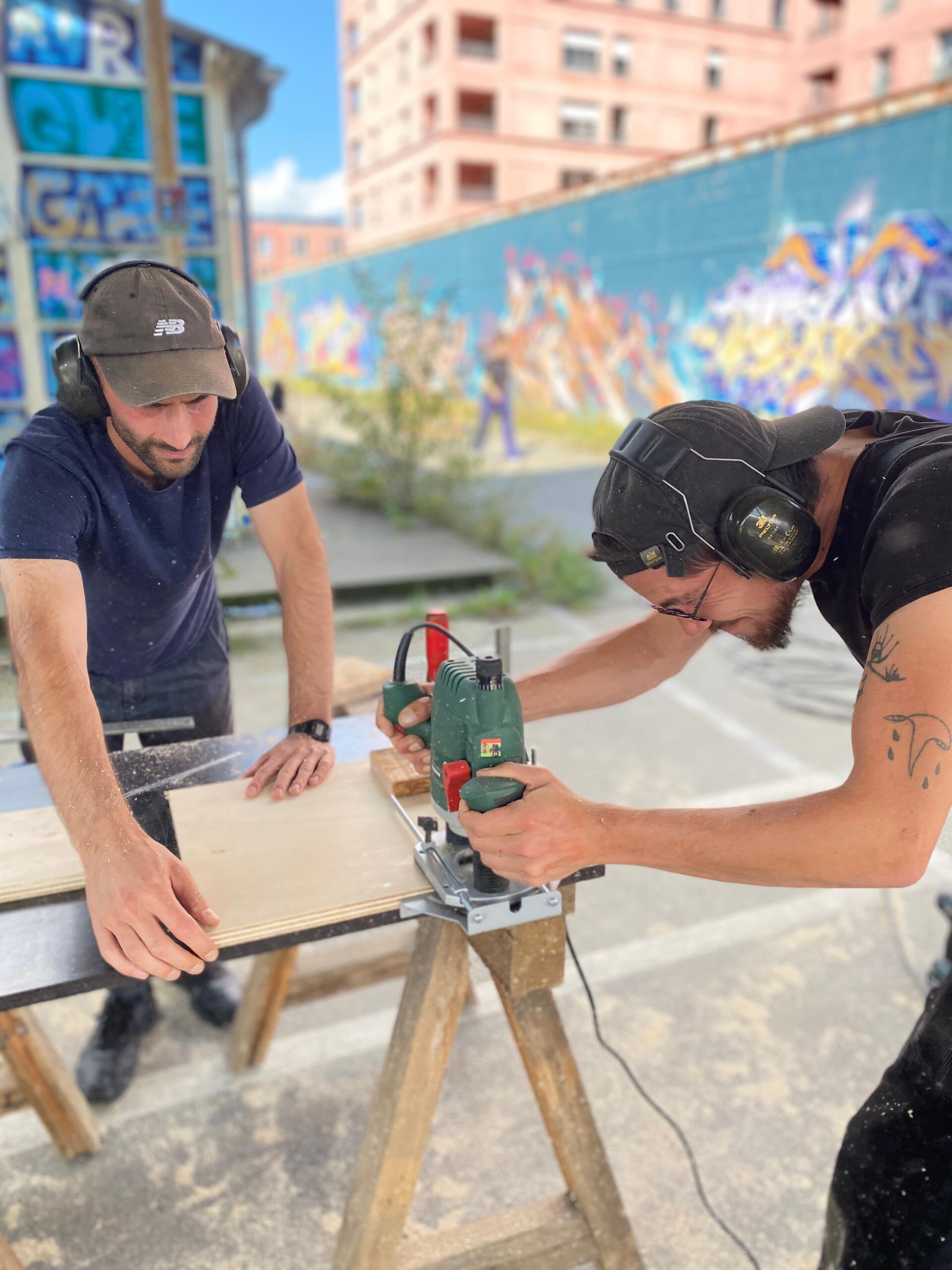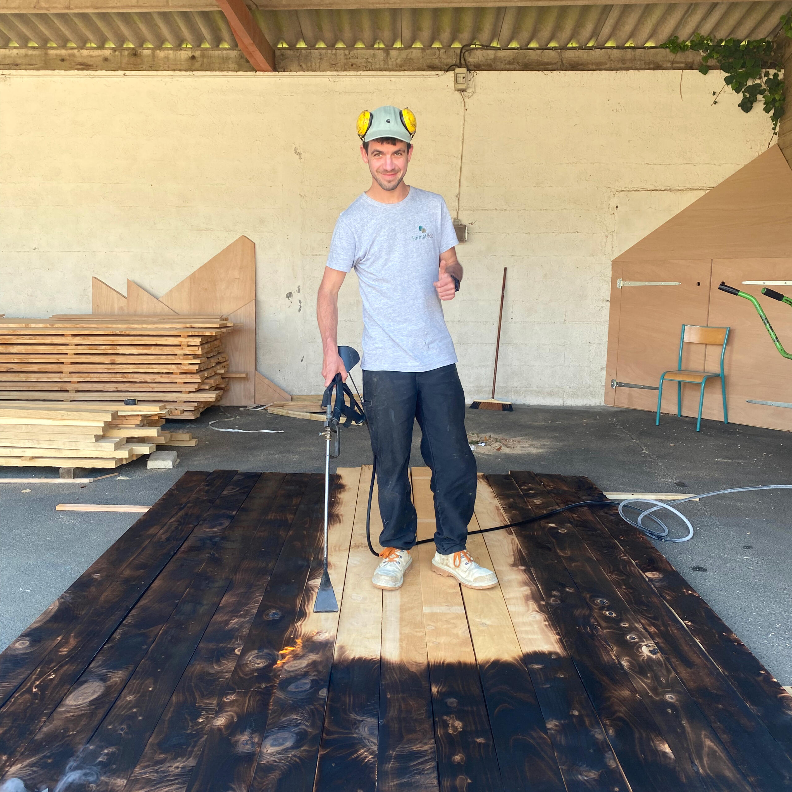 Une fois les matériaux triés et rangés par catégorie, nous décidons de transformer des palettes de pin en matière pérenne et durable pour favoriser leur réemploi en extérieur. Pour ce faire, nous organisons des ateliers de brûlage de bois avec les jeunes en service civique de Unis Cité. Grâce à la technique Yakisugi, le bois structurel des palettes est désormais résistant aux intempéries, aux insectes et au feu.