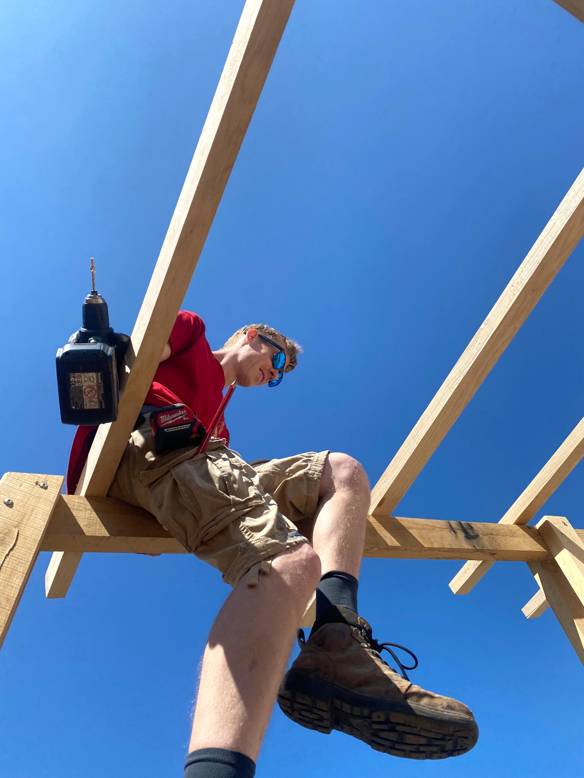 Ces caissons sont posés sur un lit de pneus de kart.Caisson par caisson, nous avons monté la structure du préau et de l'abri à tracteur en équipe avec les Cols Verts, un groupe de jeunes en Service Civique en formation, et un groupe de jeune en formation aux métiers du bâtiment.