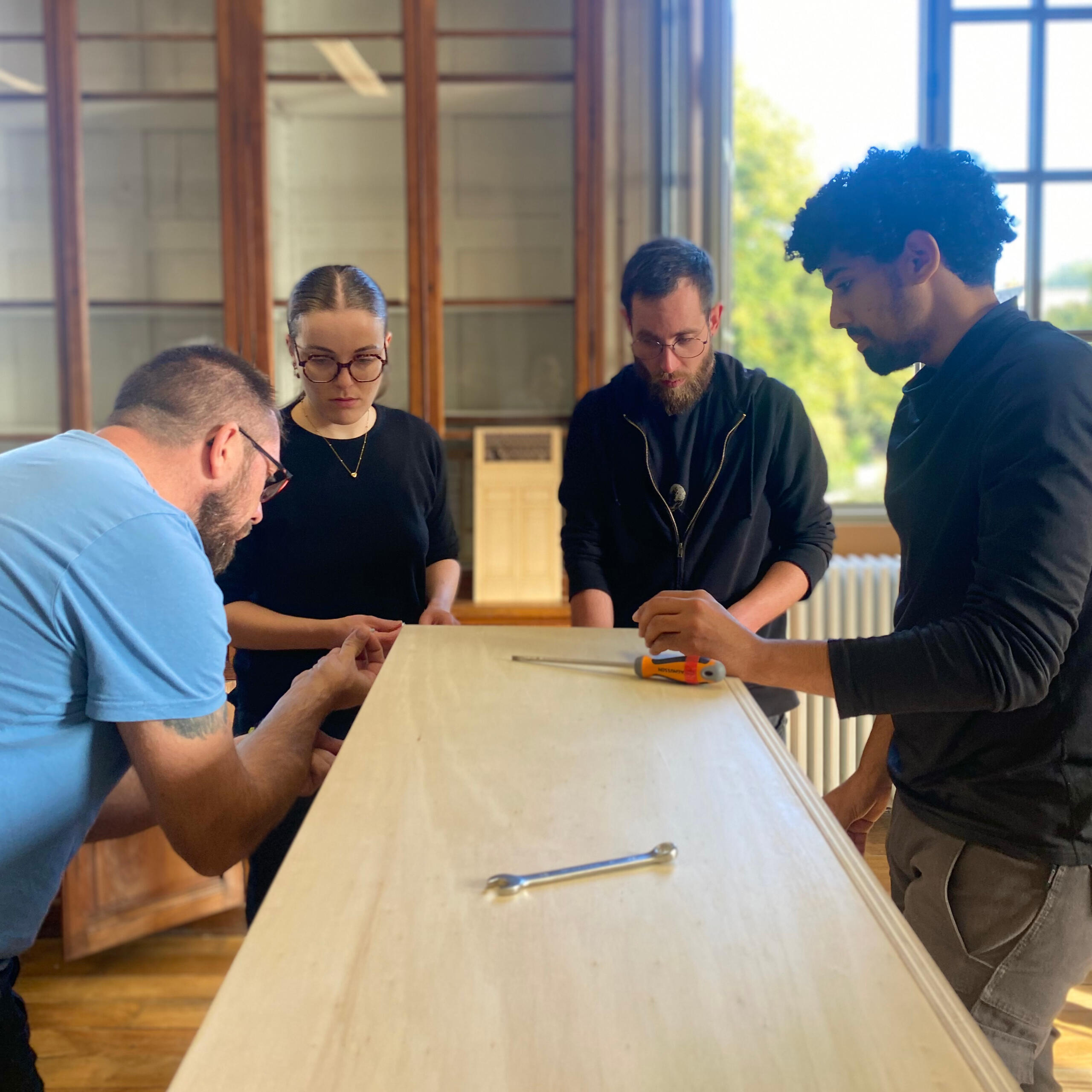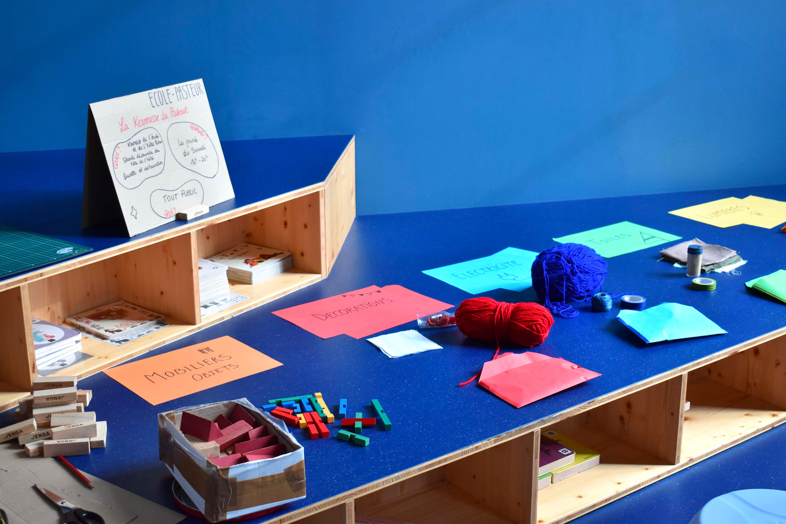 Après avoir glaner dans le sous-sol du bâtiment des matériaux de l'ancienne université, nous avons proposé un atelier de fabrication 100% réemploi pour la future «bibliothèque des communs» de Pasteur. Ancienne porte de placard, portion de table, étagère, autant d’éléments que de possibilités.