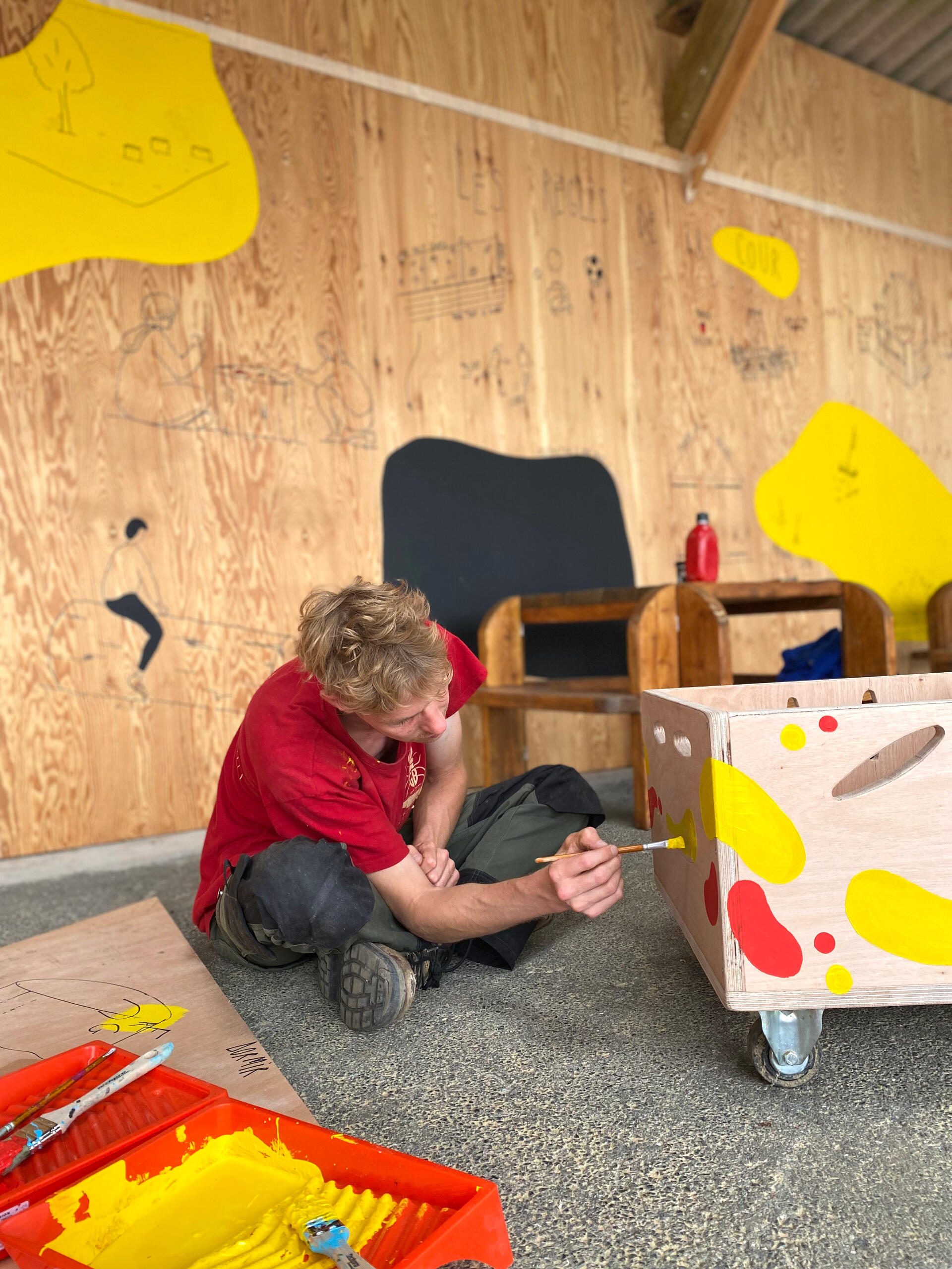 RECHERCHES GRAPHIQUESPour répondre à un besoin de rangement et de mobiliers pour les adultes nous décidons de fabriquer une flotille de caissons à roulettes pour la cour des maternelles.A la fois rangement pour les dalles de moquettes, pour de nouveaux jouets, mais aussi assises pour adultes en cas d'évènement dans la cour.Mais pour l'esthétique, nous avons fait appel aux élèves de maternelles, et aux étudiant·es du GRETA !