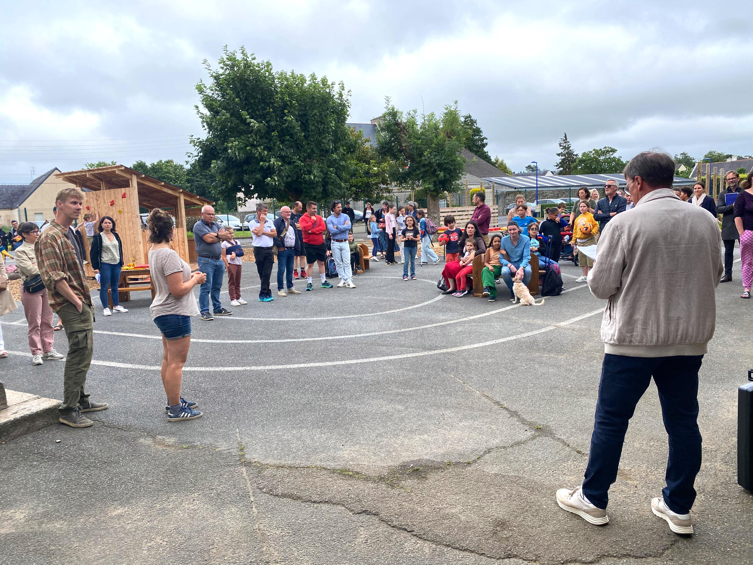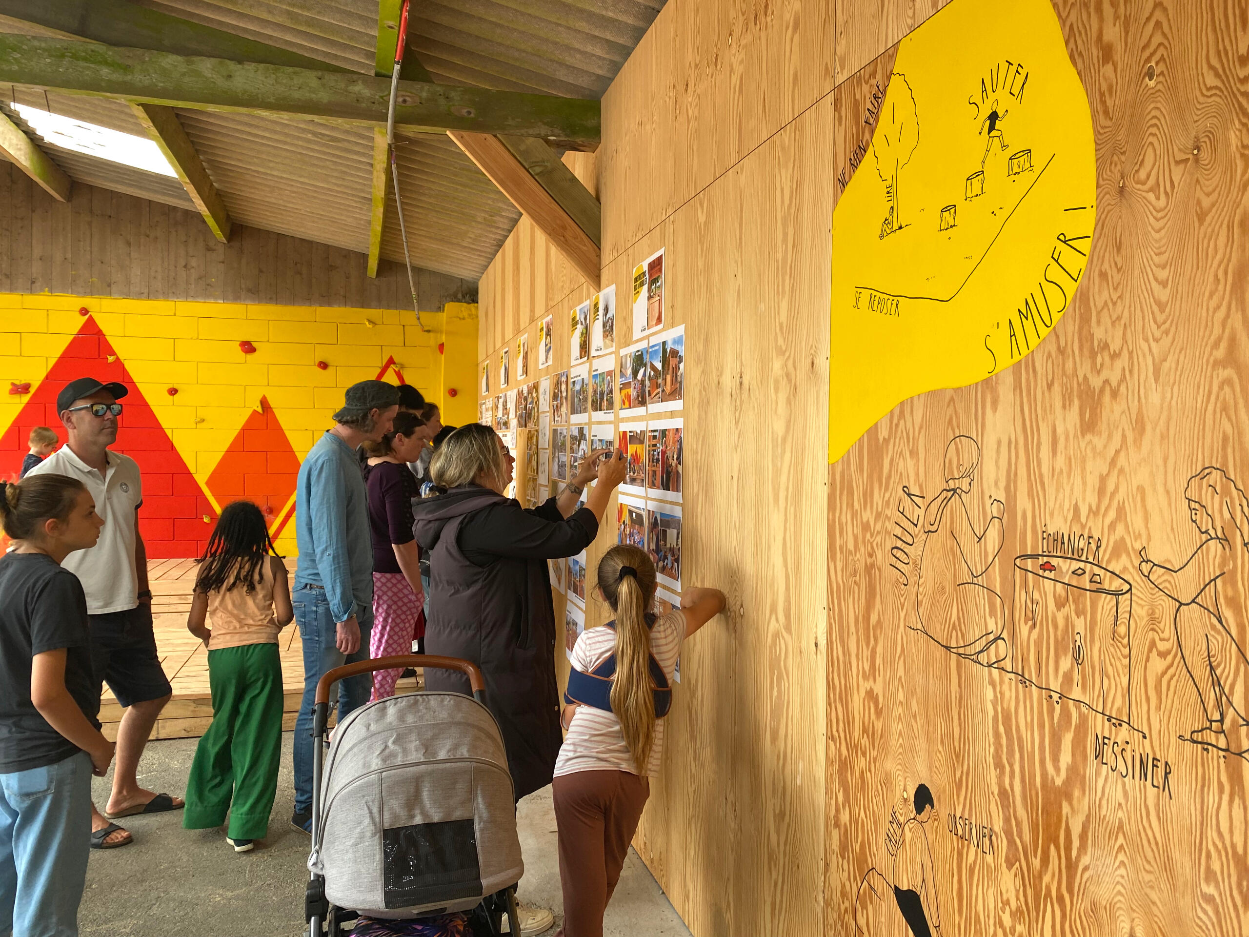 L'heure de la fête a sonné !Entre place publique et cour des maternelles ouverte au public, tout le monde déambule autour des différentes interventions que nous avons menés toute l'année et des ateliers proposés par l'équipe pédagogique reprenant les différents outils utilisés toute l'année.Drapeaux, poulies, tyrolienne, fresque, moquettes, mobilier, bien commun : plusieurs dispositifs pour faciliter l'appropriation et le partage d'un lieu commun.