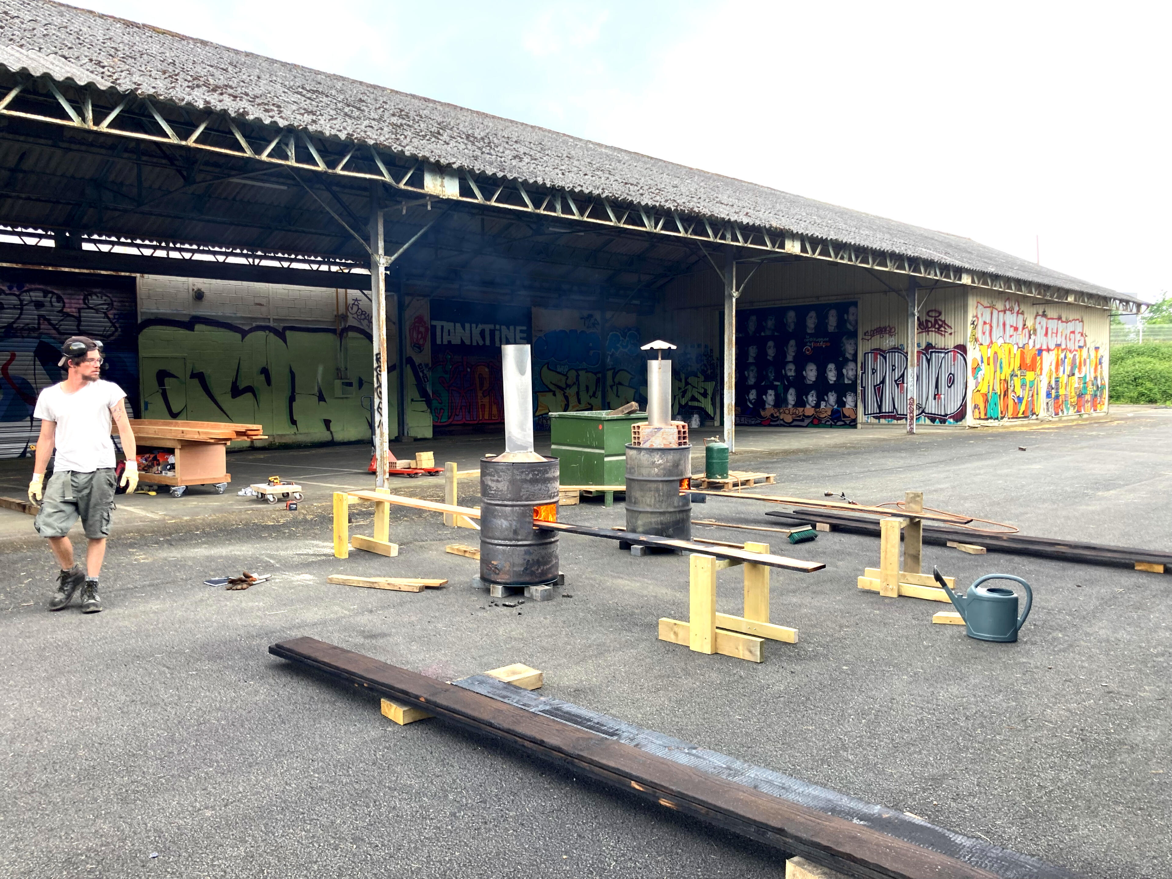 Ce chantier a été l'occasion d'expérimenter différentes techniques de brûlage de bois : au chalumeau, sur un feu "classique", en fabricant une cheminée, et enfin en perçant un bidon métallique dans lequel les pièces de bois passent à la chaîne (technique la plus efficace et rapide à mettre en place !).