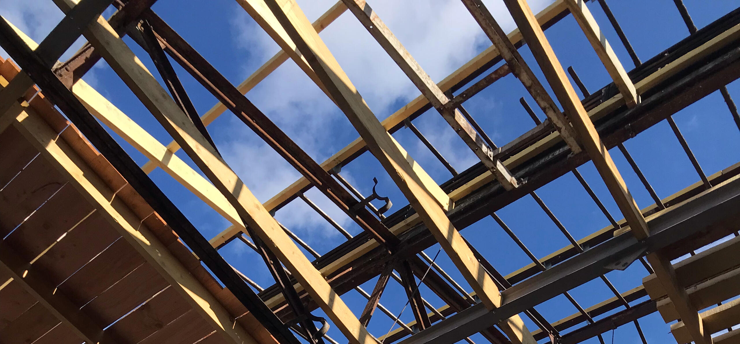 RÉHABILITATION DE LA TOITURELe projet a commencé par une remise à nu : déposer l’existant pour repenser entièrement la toiture. Très vite, le choix d’une végétalisation s’est imposé, impliquant de reconstruire une charpente capable d’en supporter les contraintes. Cette étape a fait l’objet d’une étude précise pour garantir la solidité de l’ensemble dans le temps.Peu à peu, la nouvelle toiture a pris forme. Un support en OSB vient contreventer la charpente, recouvert d’une membrane d’étanchéité collée et relevée en périphérie pour assurer une protection optimale. Les planches de rive, brûlées artisanalement par nos soins, viennent border l’ensemble. Le brûlage du bois est primordial pour résister aux agressions climatiques tout en affirmant une esthétique brute et soignée.