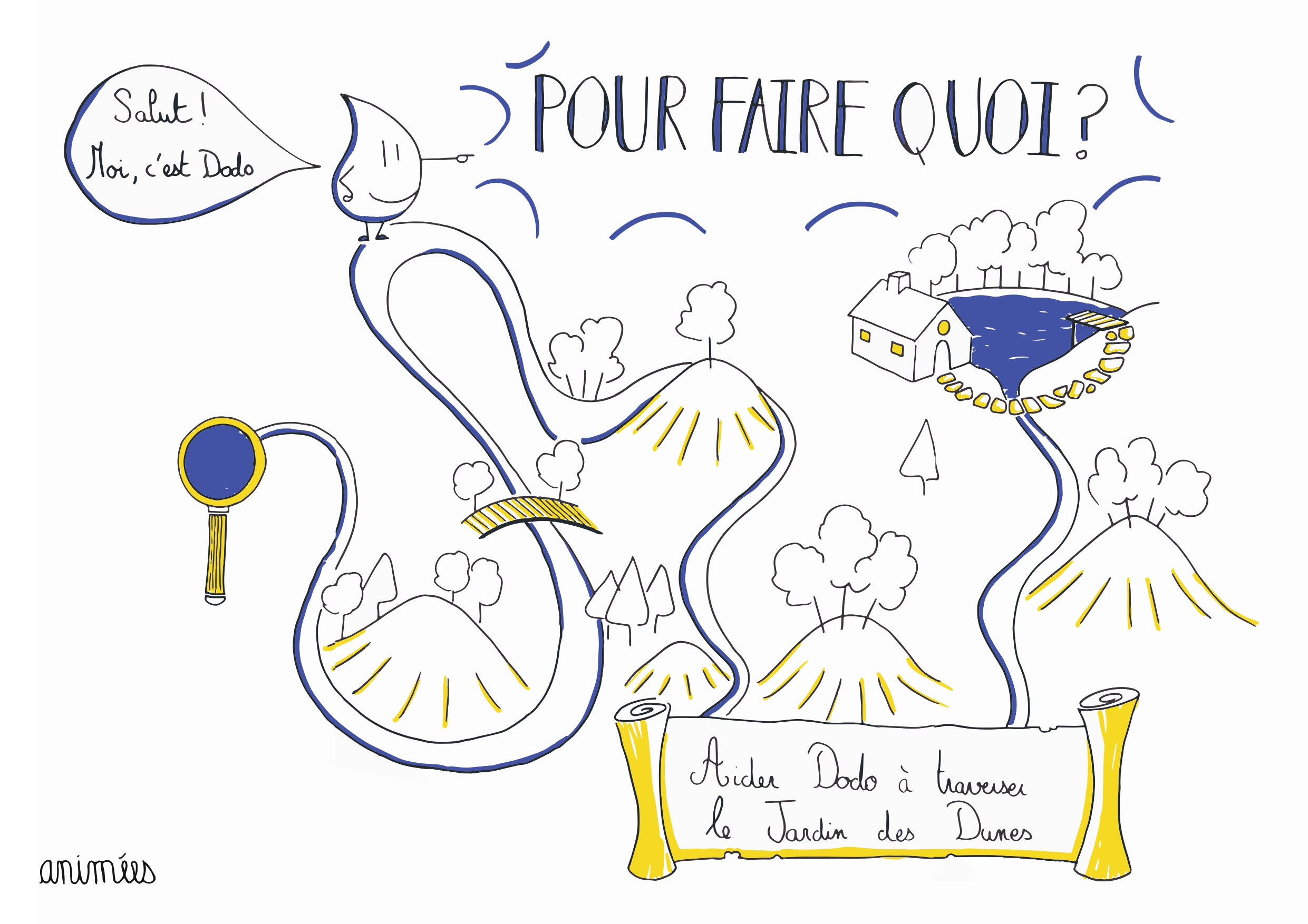 La rencontreAfin d'embarquer le conseil municipal des enfants dans ce processus de renaturation, nous avons choisi de raconter l'histoire de Dodo la goutte d'eau. L'eau étant au centre de ce processus, elle nous permet d'étudier la topographie, les types de milieux, et les végétaux qui lui sont liés. Le Jardin des Dunes fait face à la Résidence des Dunes où résident les séniors de la ville. Ielles seront intégré.es au projet pour faire du nouveau jardin une œuvre collective.